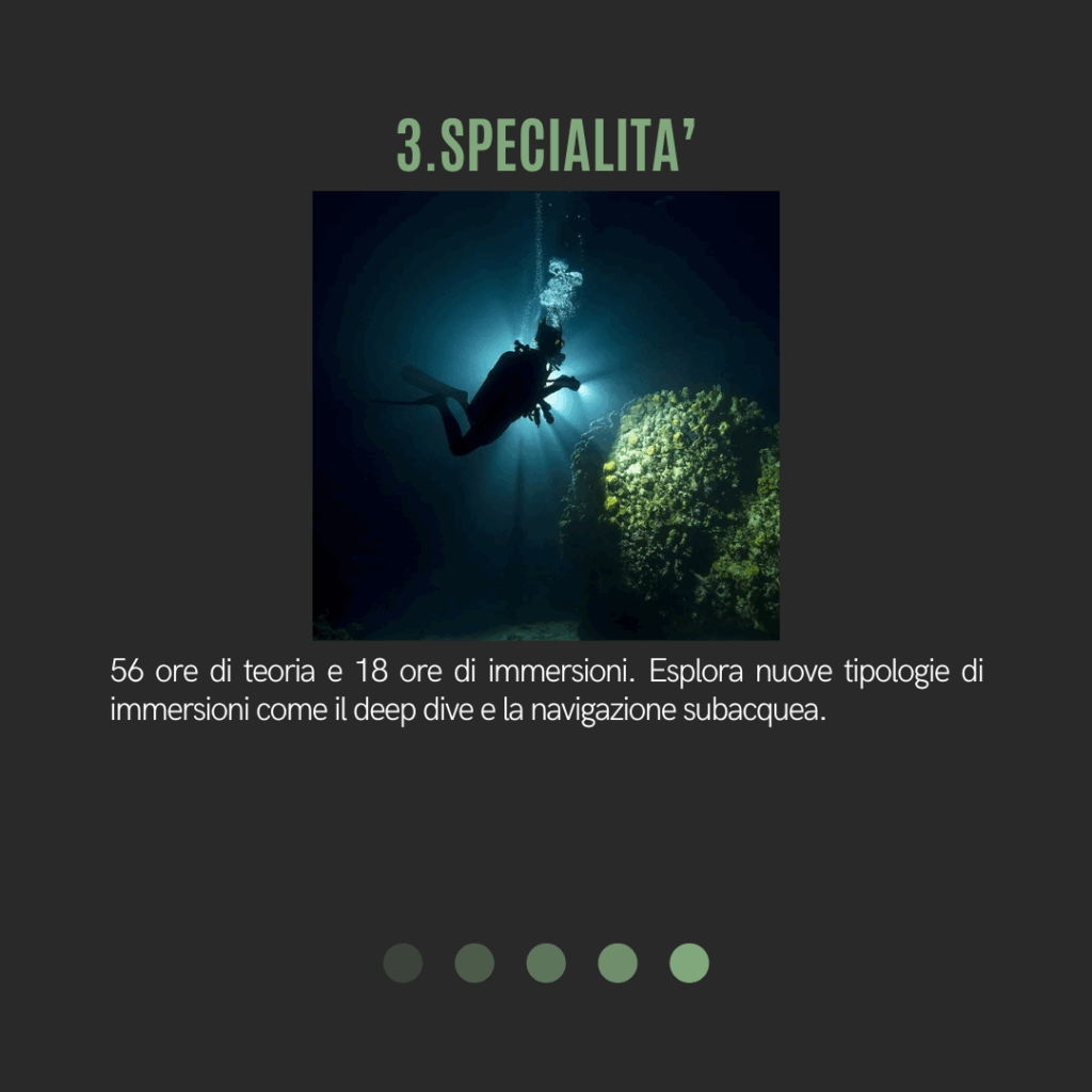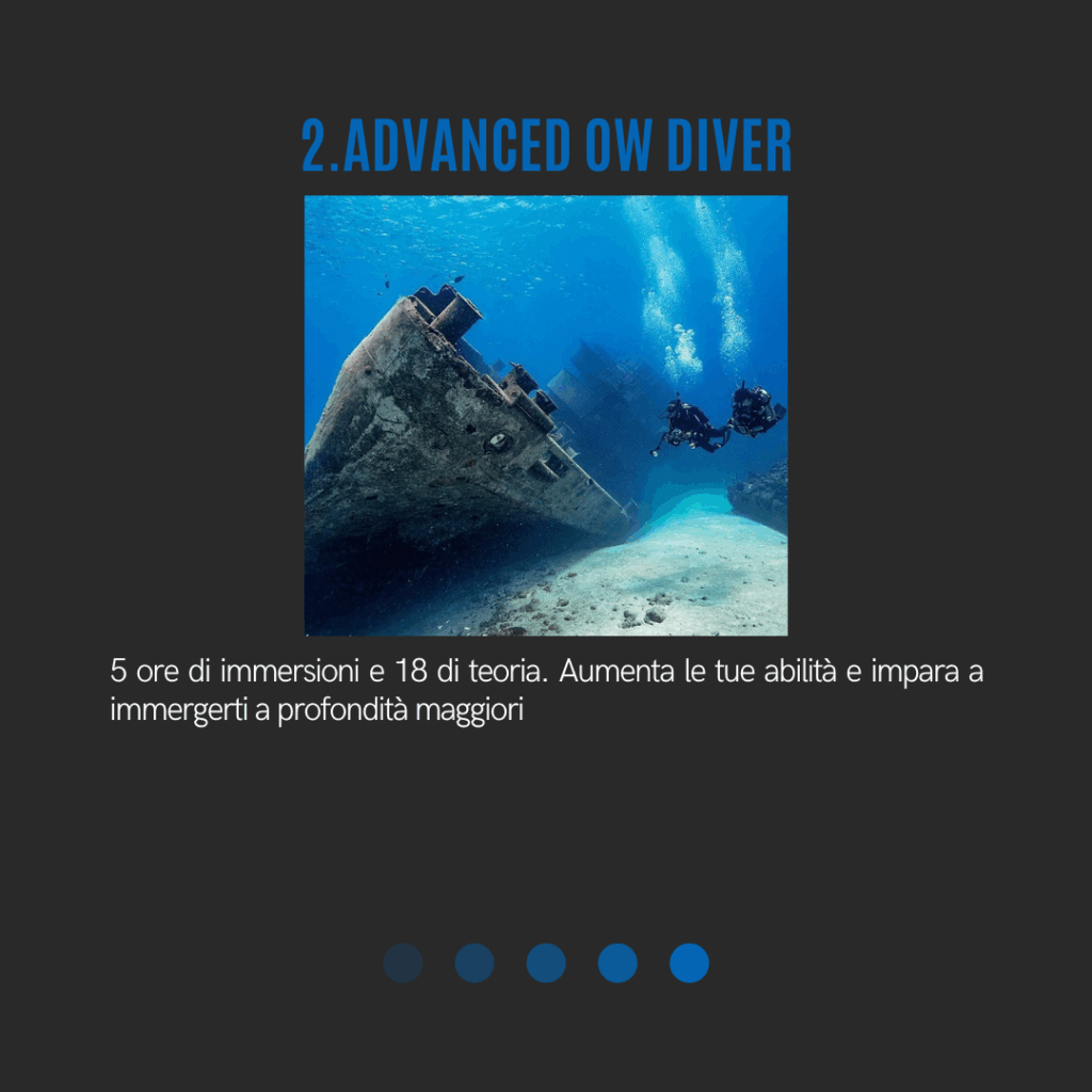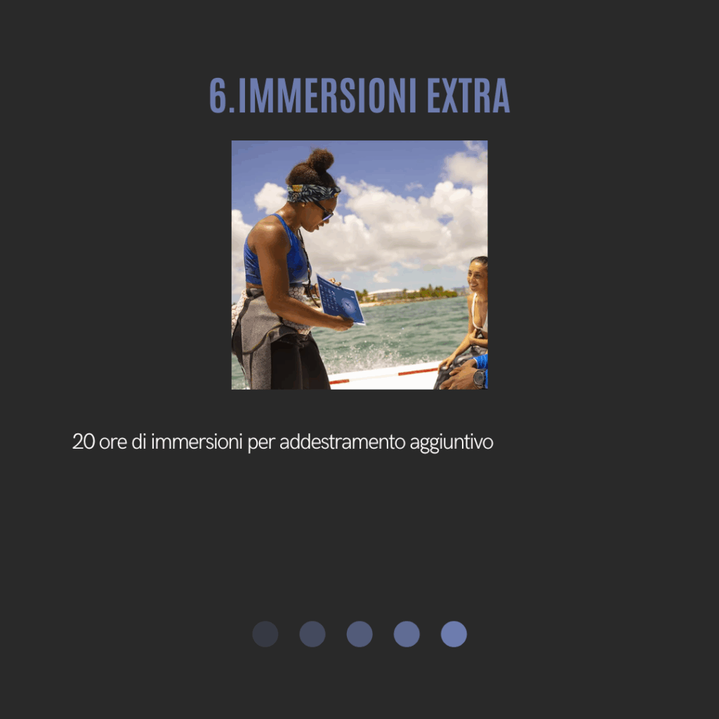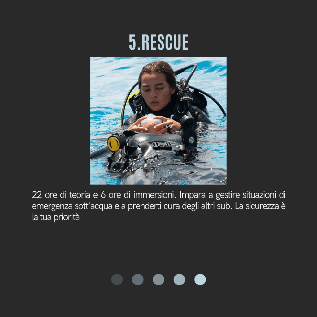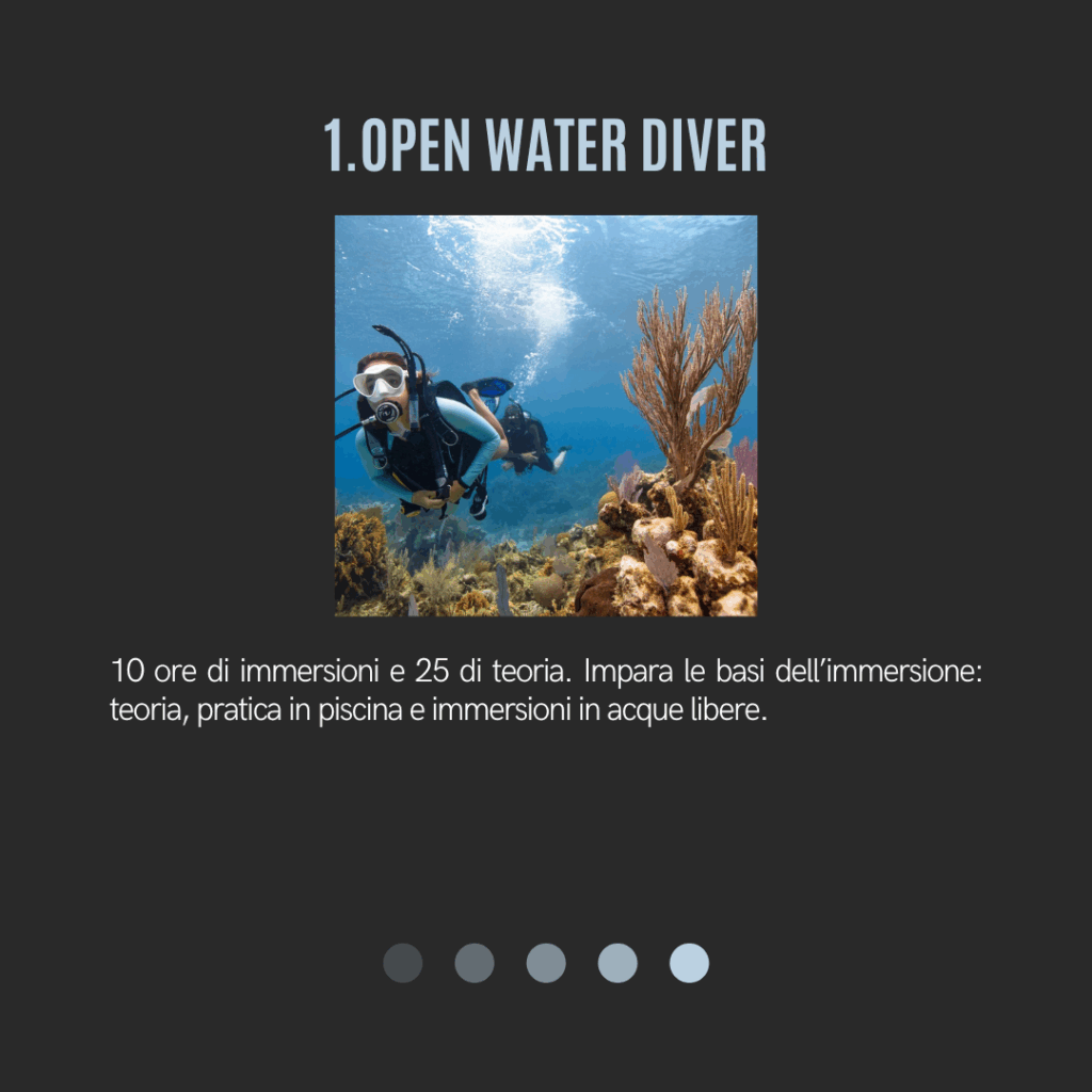 Il programma prevede una preparazione graduale e strutturata, che accompagna l’allievo dalle basi fino al livello di Divemaster, sviluppando competenze tecniche, conoscenze teoriche e capacità di gestione dei subacquei.