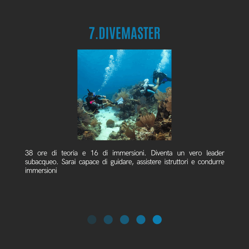 Formazione teorica e pratica avanzata per acquisire tutte le competenze necessarie e lavorare come Divemaster riconosciuto a livello internazionale.